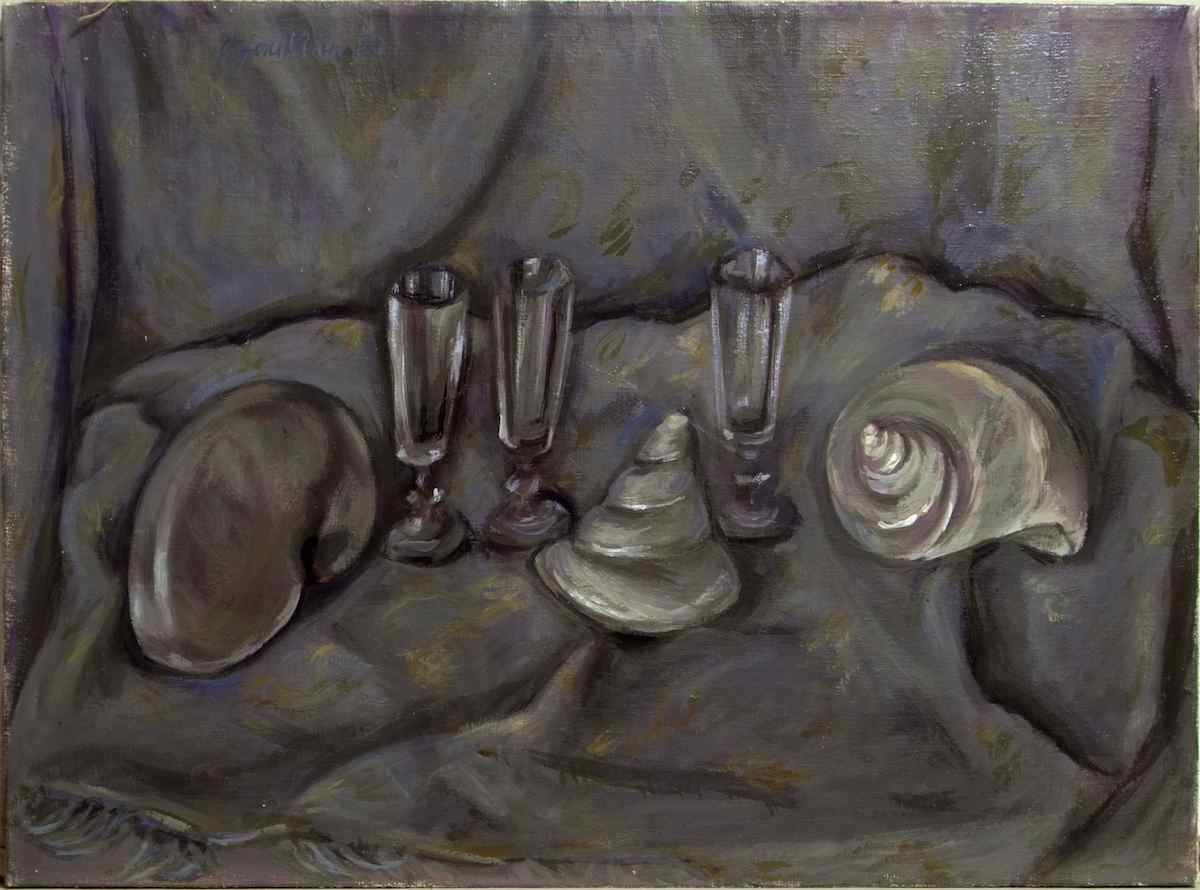 1986 Nautilus, Muscheln und Gläser vor blau (70x52) #148