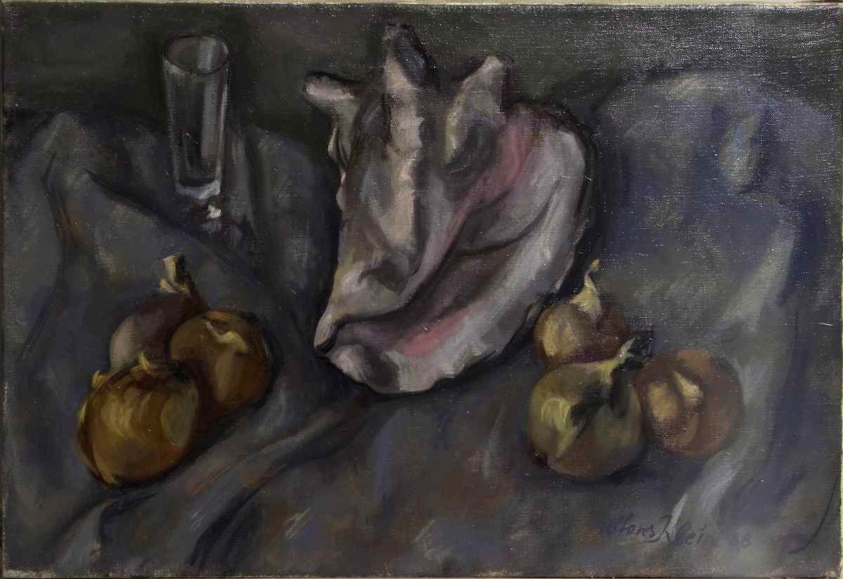 1988 Sechs Zwiebeln, große Muschel und Glas (55x38) #171