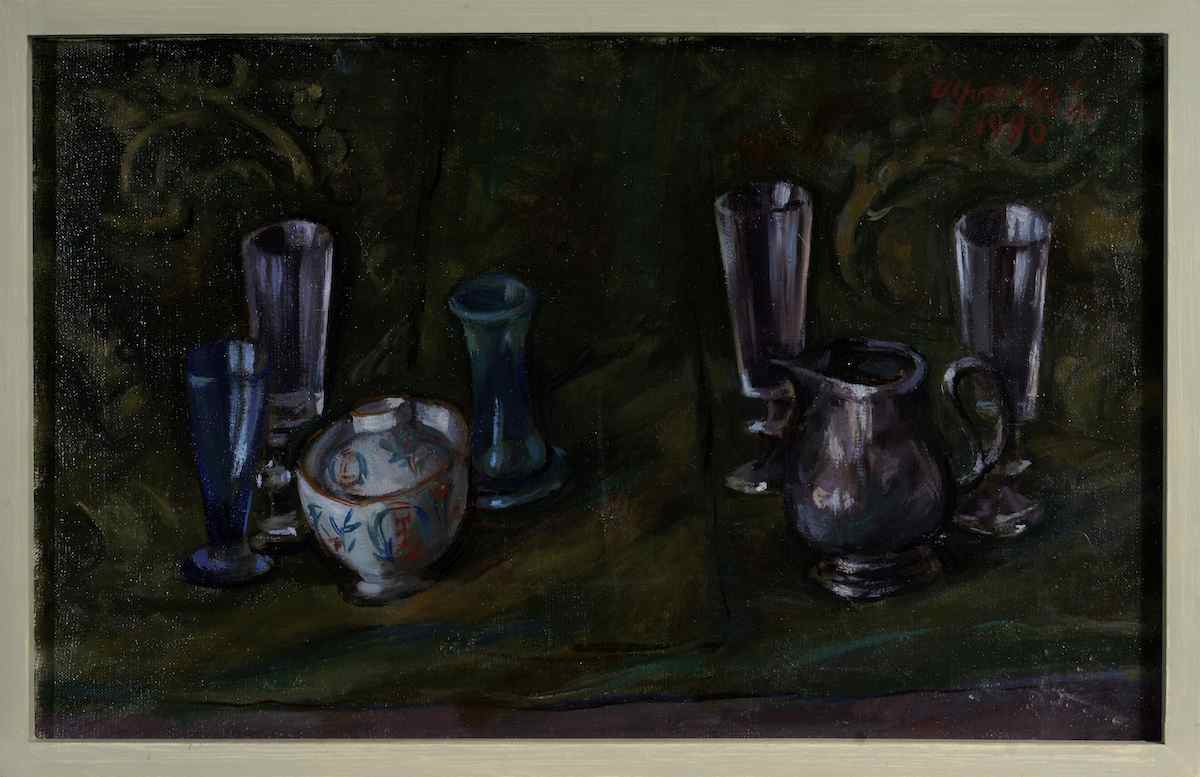 1990 Sechs Gläser, Keramikdose und Silberkännchen auf oliv (61x38) #018