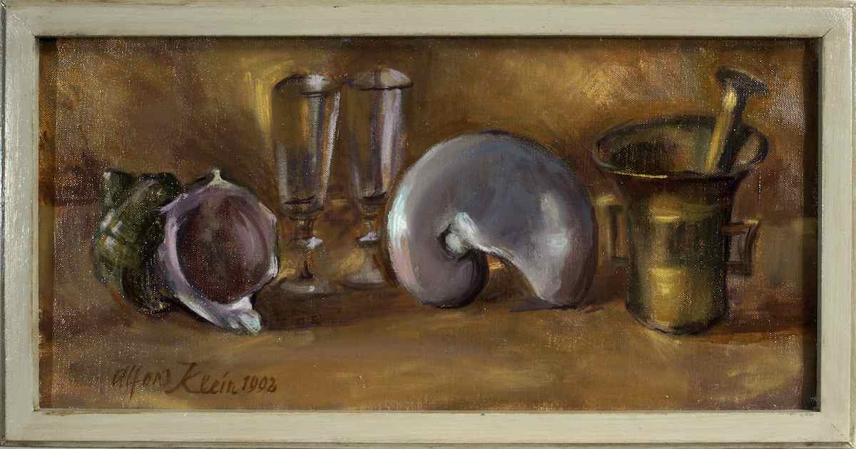 1992 Muscheln, Nautilus, Gläser und Mörser auf goldocker (49x24) #005