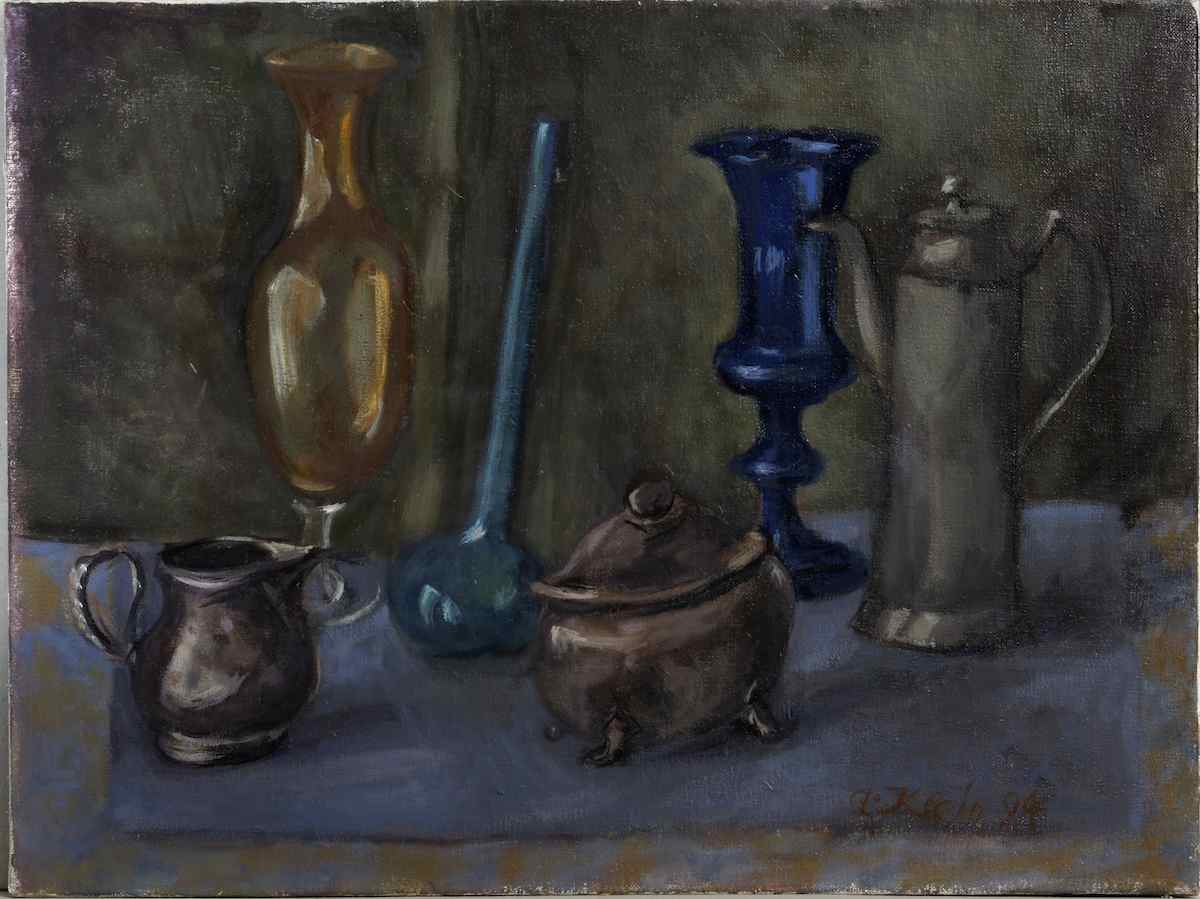 1994 Blaue Vase, Zinnkanne, Silberkännchen und -dose (61x46) #177