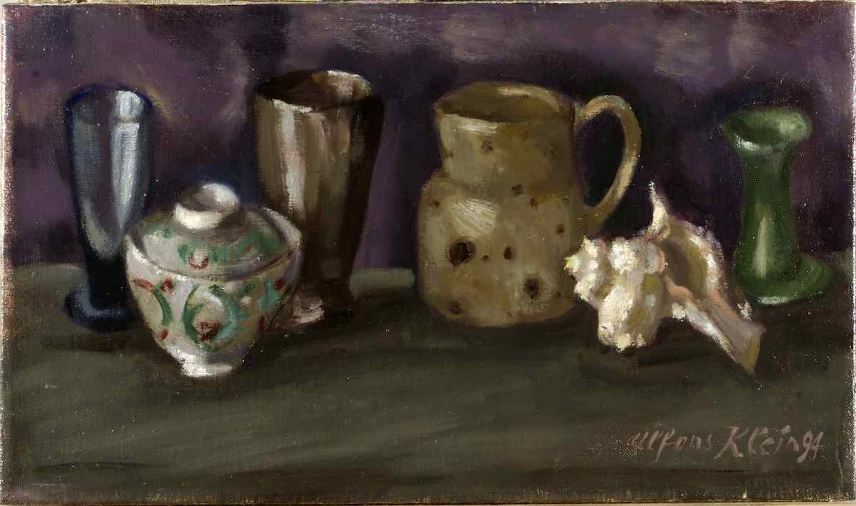 1994 Zuckerdose, Muschel, kleiner Tonkrug, Silberbecher, Gläser (41x24) #103