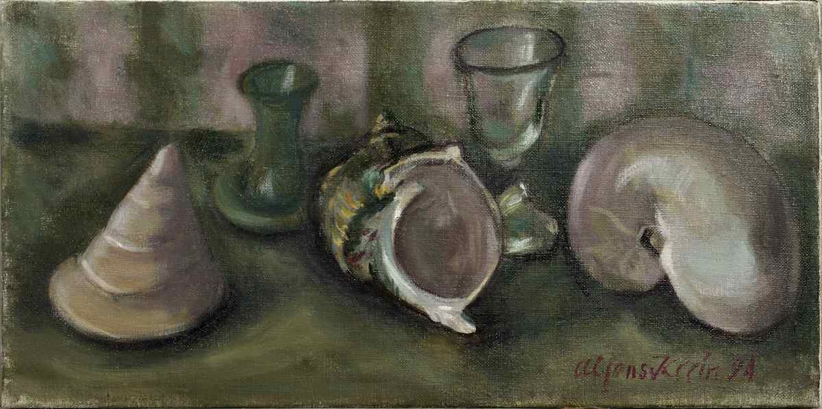 1994 Zwei Muscheln, Nautilus, Gläser auf grün (49x24) #038