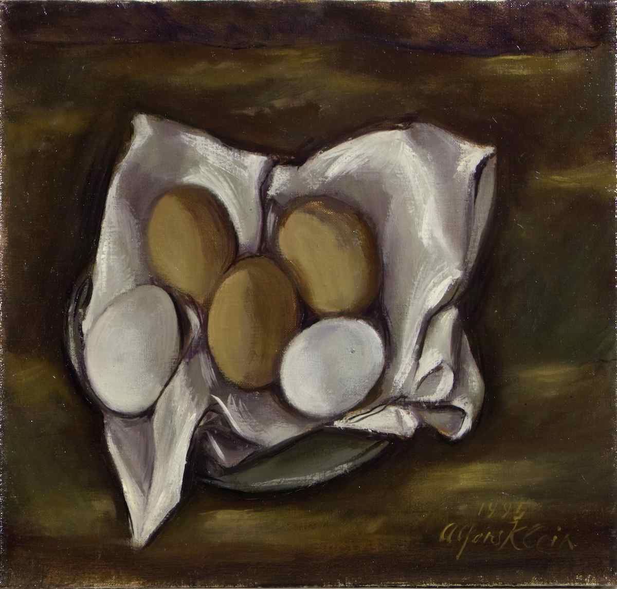 1995 Fünf Eier und weißes Tuch auf Zinnteller auf braun (35x33) #026
