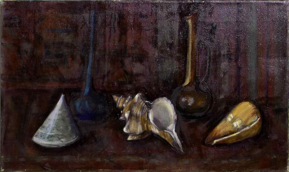 1995 Muscheln, farbige Gläser auf rot (55x33) #313
