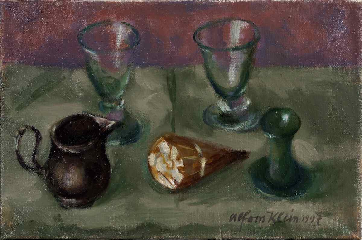 1997 Zwei Gläser, Silberbäumchen, Muschel auf grün (41x27) #051