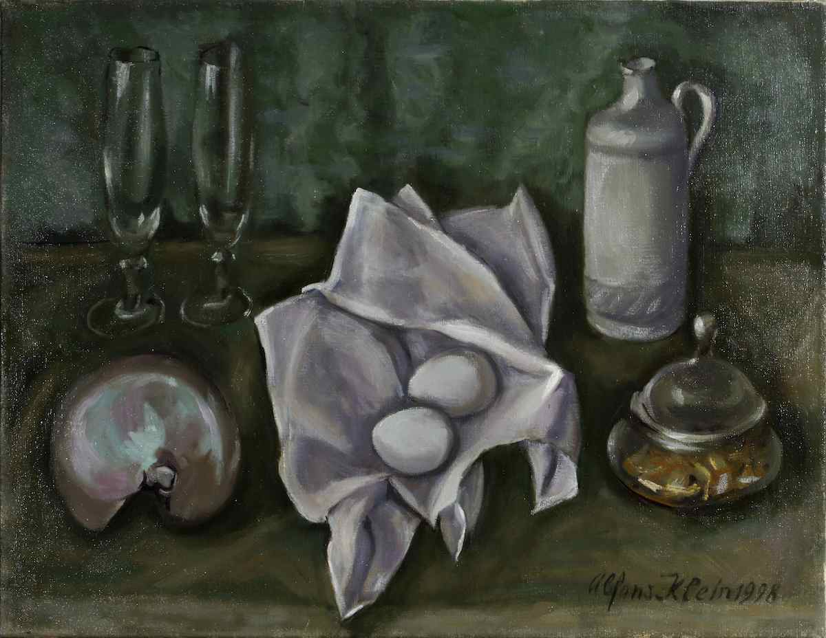 1998 Zwei Eier auf weißem Tuch, Ölkrug, Bonboniereauf grün (64x50) #333