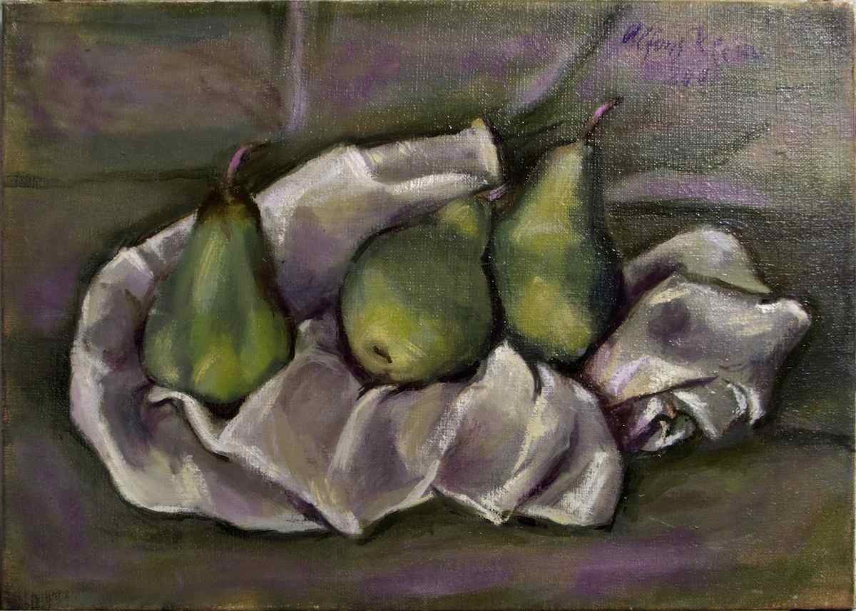 2001 Drei Birnen auf weißem Tuch (46x33) #186