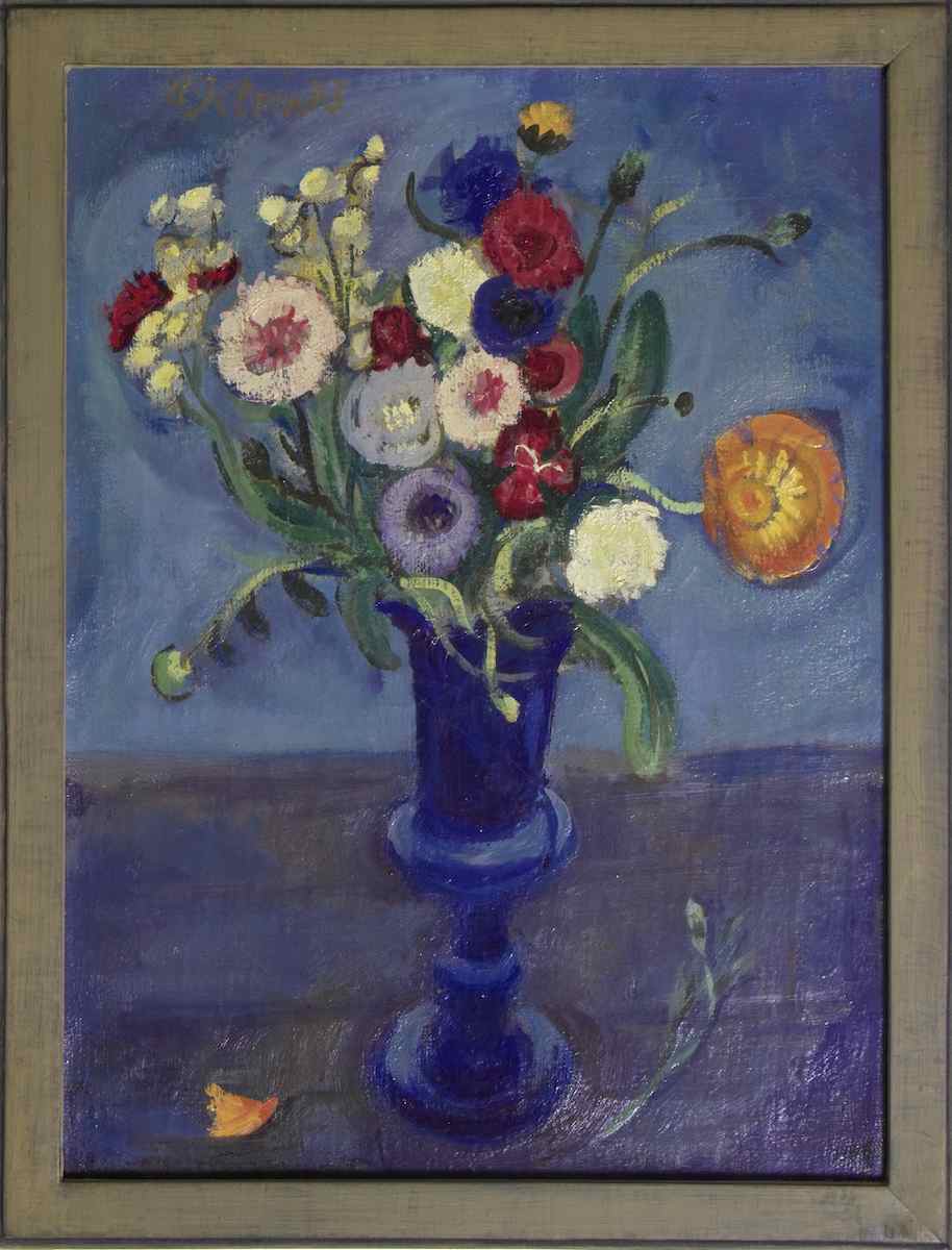 1973 Zynien und Strohblumen in blauer Vase vor blau (30x40) #063
