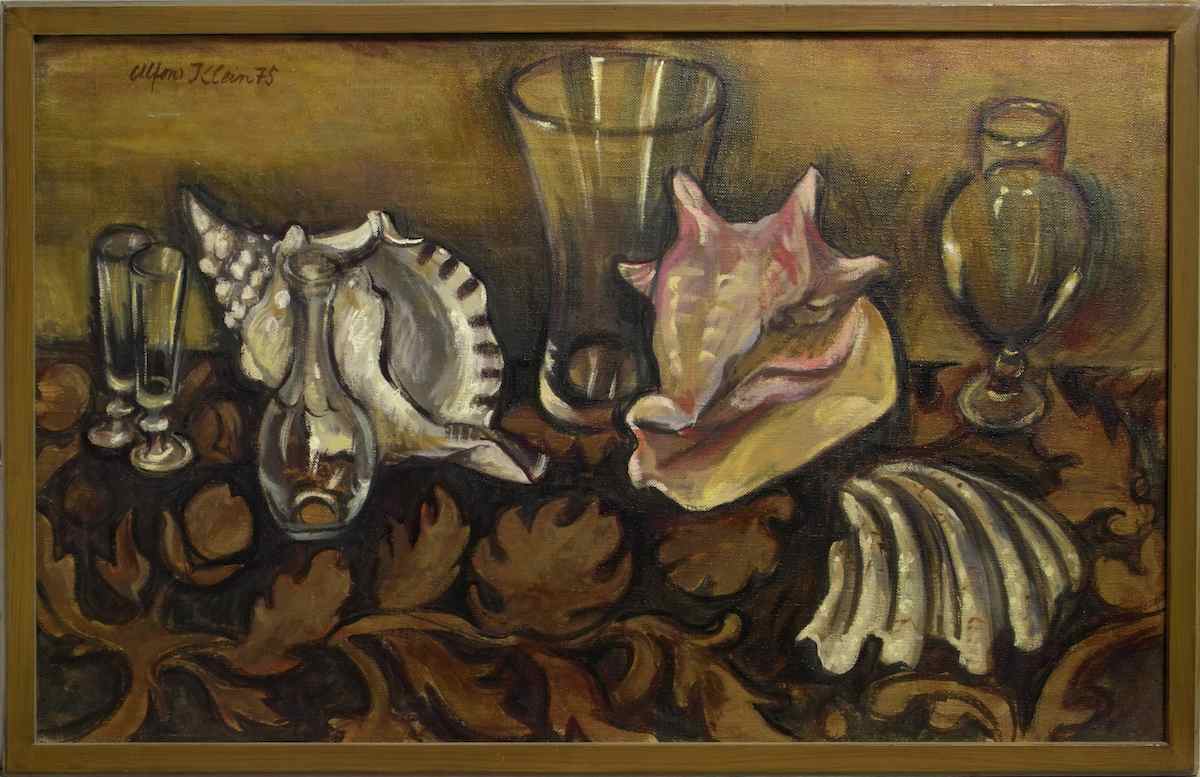 1975 Gläser, Vasen, Muscheln auf Brokatdecke (80x50) #156