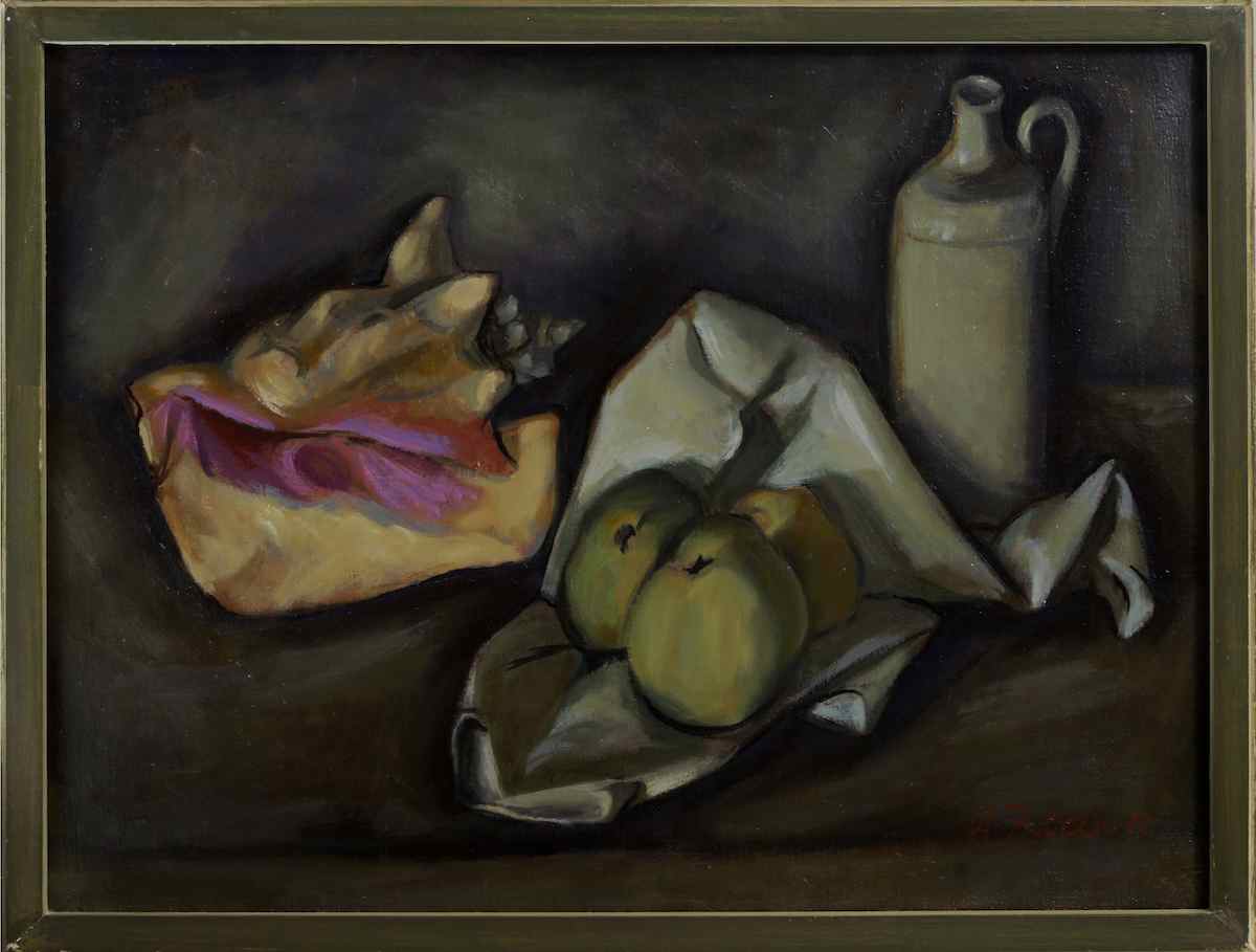 1982 Muscheln, Ölkrug und Äpfel (61x46) #260