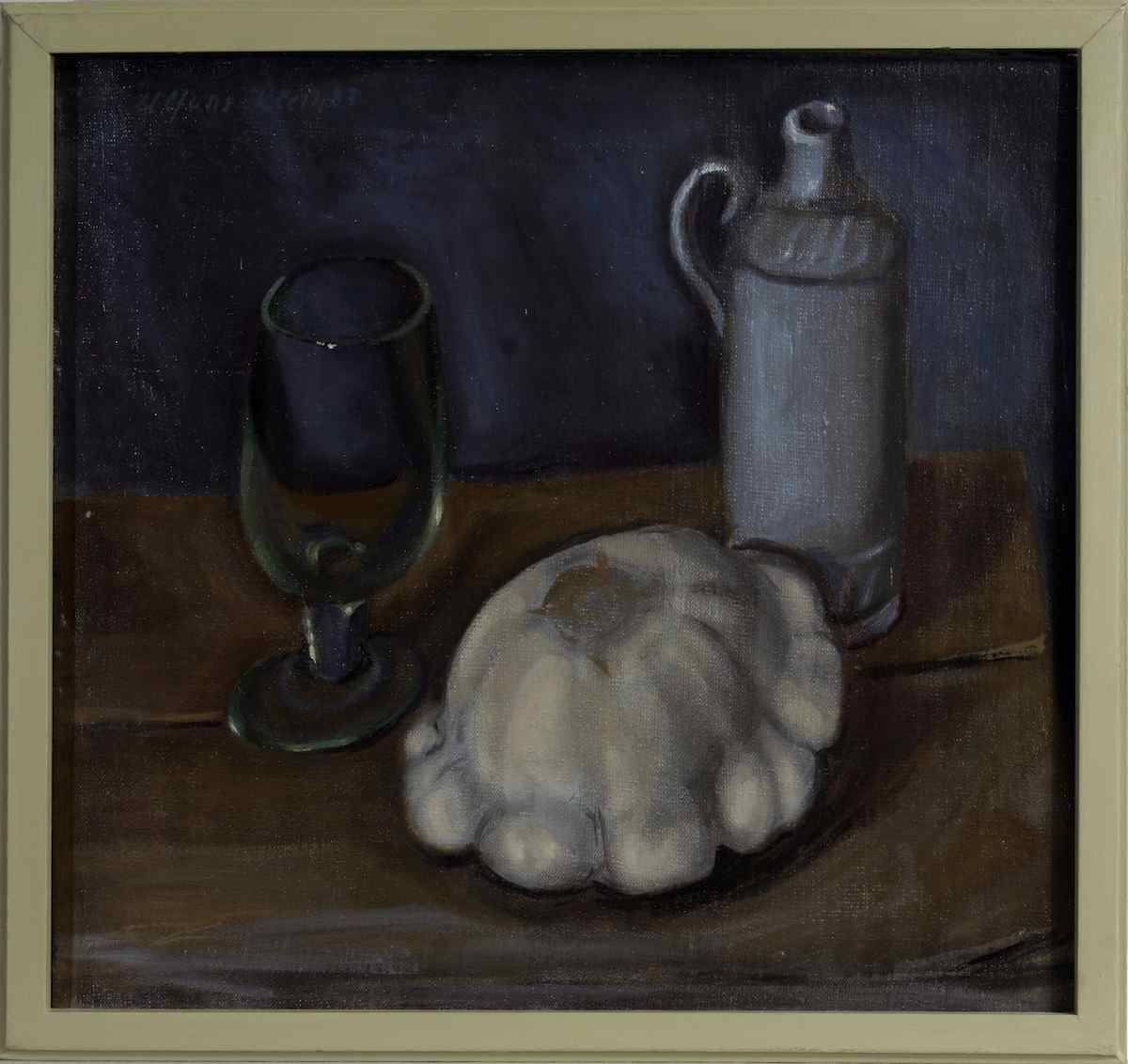 1983 Kürbis, weißer Ölkrug vor blau (47x44) #336